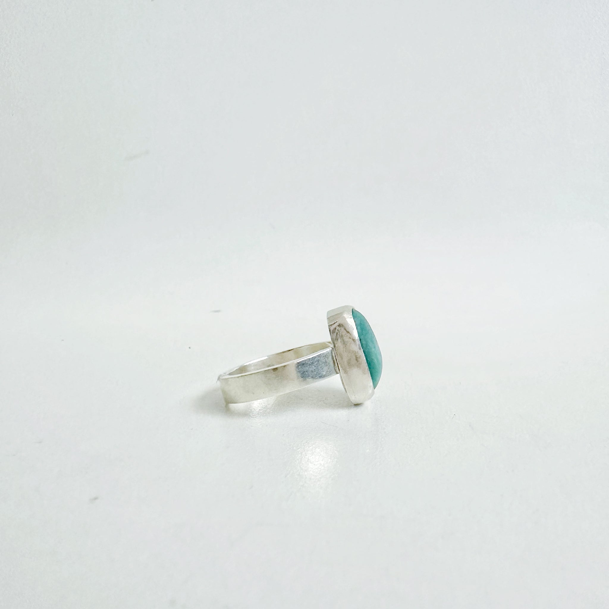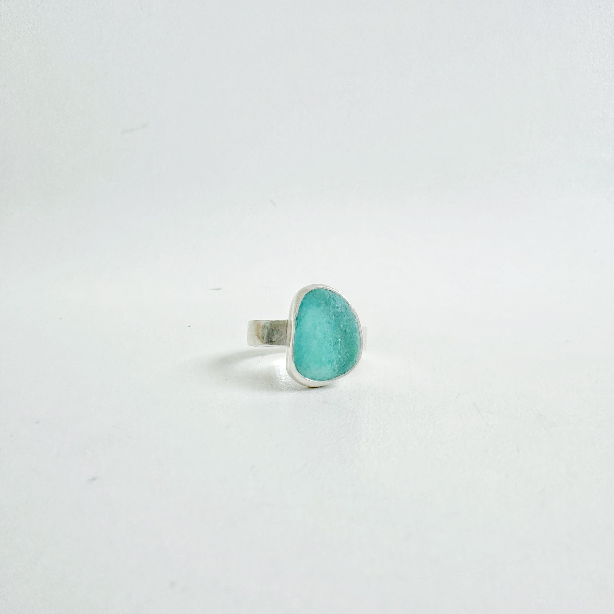 A vivid teal piece of sea glass is set in a smooth sterling silver bezel, creating a ring that’s simple, modern, and easy to wear every day. The color has a striking, luminous quality that stands out without feeling overpowering.